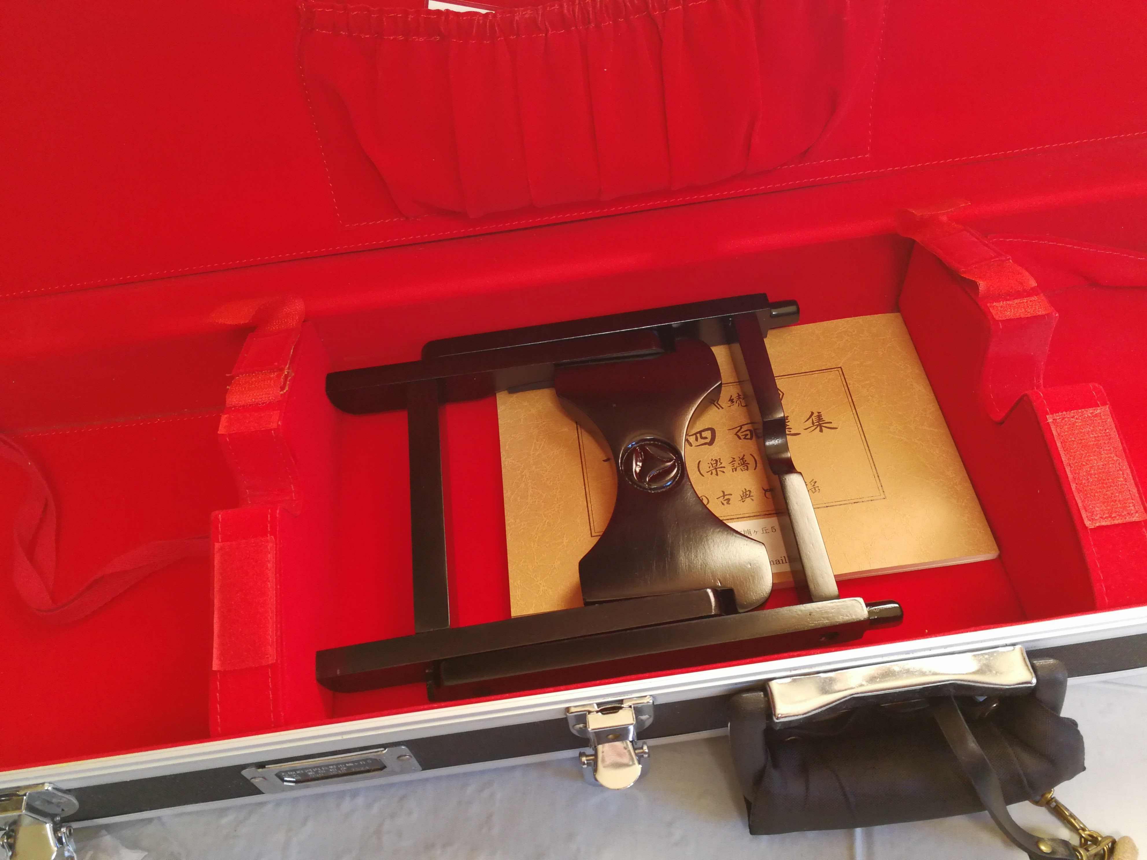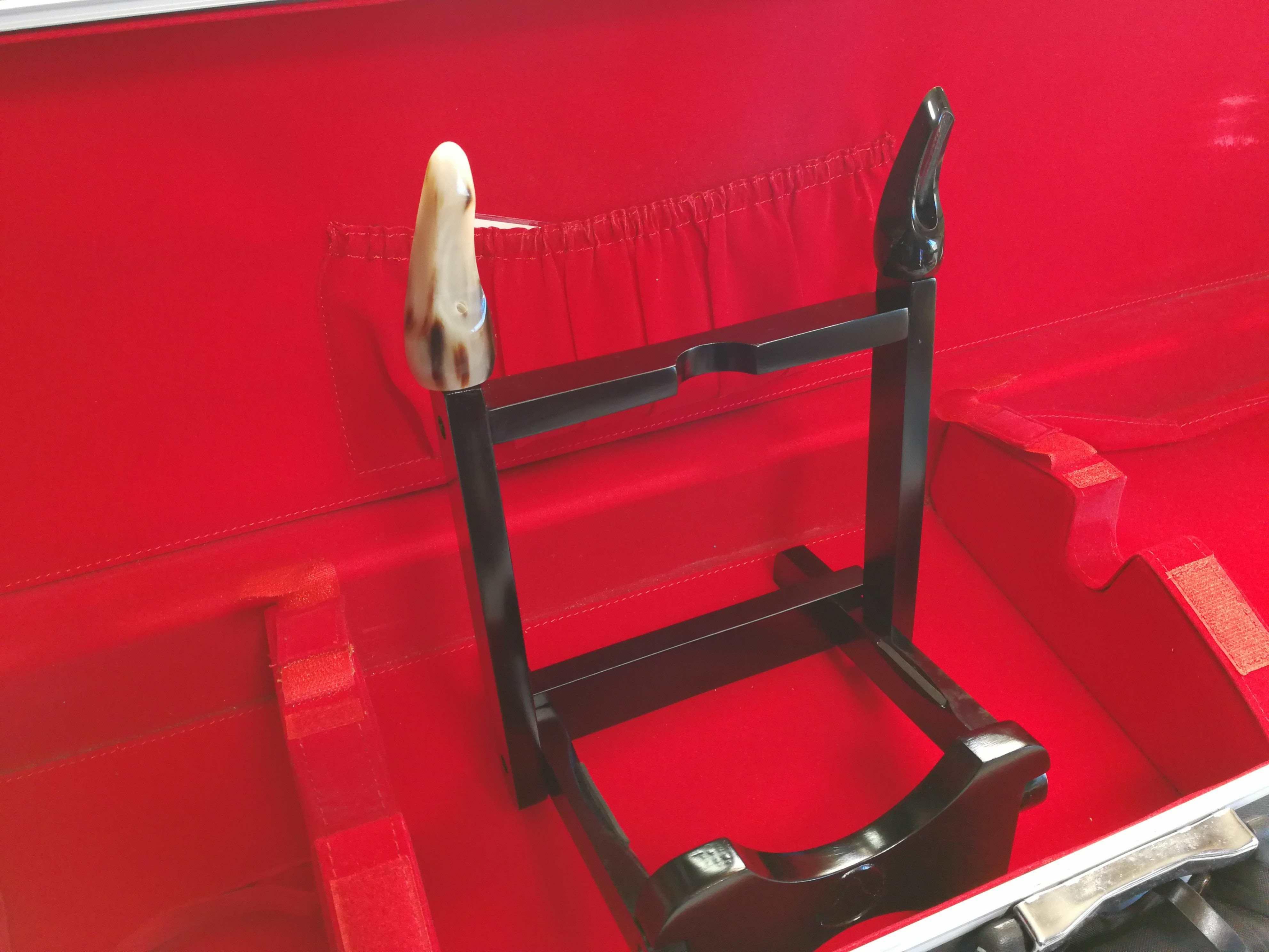 折たたみ式の木製の三線立てです。コンパクトでハードケースの仕切り部にも入る大きさです(33mm×256mm×191mm)